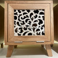 Mesa de noche Nanna elaborada en madera flor morado macizo, ideal para darle un toque único con este diseño tallado.