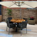Nuestra mesa de comedor esta elaborada en madera maciza teca, ideal para muebles de exterior.
